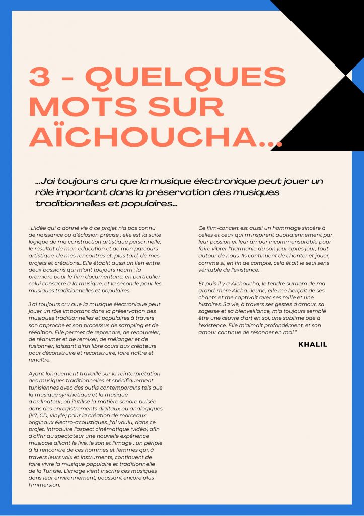 بعد أن اشتغلت لفترة طويلة على الموسيقى التقليدية التونسية وأدائها بطريقة مغايرة بالاعتماد على وسائل معاصرة مثل جهاز التوليف (السنتيتيزور) والكمبيوتر، حيث كنت استخدم المادة الصوتية المستمدة من تسجيلات رقمية أو تناظرية (شرائط كاسيت، أقراص مضغوطة، إسطوانات فينيل) لانتاج مقطوعات موسيقية كهروصوتية مبتكرة ، أردتُ في هذا المشروع إدخال عنصر الصورة المتحركة (الفيديو) لاقتراح تجربة موسيقية جديدة على الجهور، تجربة تجمع بين العرض الحيّ والصوت والصورة ، تتخذ صورة رحلة للإلتقاء بكل هؤلاء الرجال والنسوة الذين يضمنون من خلال أصواتهم وآلاتهم، بقاء الموسيقات الشعبية والتقليدية التونسية واستمراريتها. وتؤدي الصورة في هذا المشروع دورا أساسيا وهو إظهار تلك الموسيقات في بيئتها الأصلية ، مما يتيح الانغماس والغوص فيها.