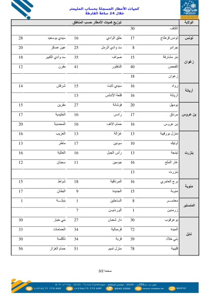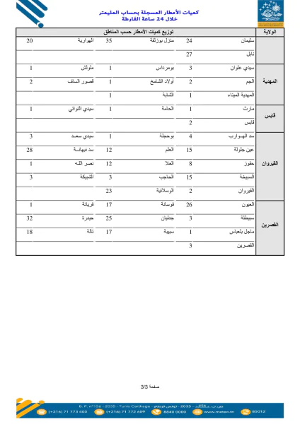 وسلجت معتمدية قليبية من ولاية نابل أعلى كميّة حيث قدّرت بـ 76 مليمترا تليها أزمور بـ 50 مم وبوفيشة 36 مم فقربة والحمامات بـ 34 مم ثم قرمبالية 31 مم ومكثر من ولاية سليانة بـ 27 مم.