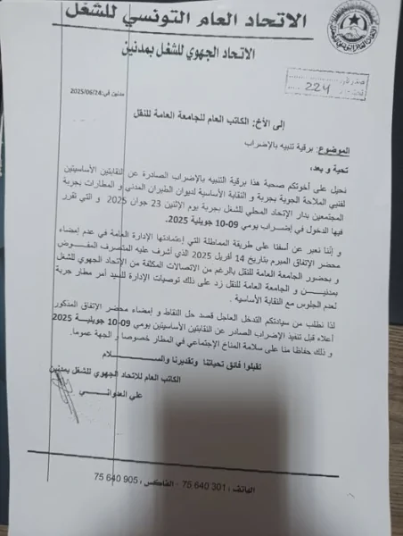 هددت النقابتان الأساسيتان لفنيي الملاحة الجوية والنقابة الأساسية لديوان الطيران المدني والمطارات بجربة بالدخول فيإضراب يومي 09 و10 جويلية 2025، في صورة عدم إمضاء محضر الإتفاق الممضى بتاريخ 14 أفريل 2025.