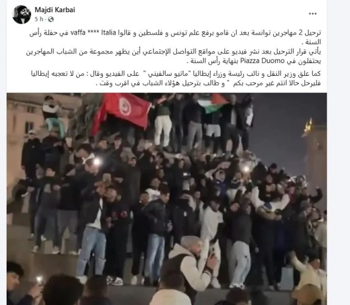 قامت السلطات الإيطالية بترحيل مهاجرين تونسيين بعد انتشار فيديو على مواقع التواصل الاجتماعي يظهر مجموعة منهم وهم يحتفلون بقدوم رأس السنة في ساحة دوومو بمدينة ميلانو.