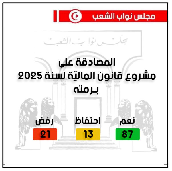 صادق مجلس نواب الشعب، اليوم الاثنين، خلال جلسة عامة مسائية مشتركة على مشروع قانون المالية لسنة 2025 برمته، بعد أن انطلق في النظر في المشروع منذ يوم 26 نوفمبر 2024.