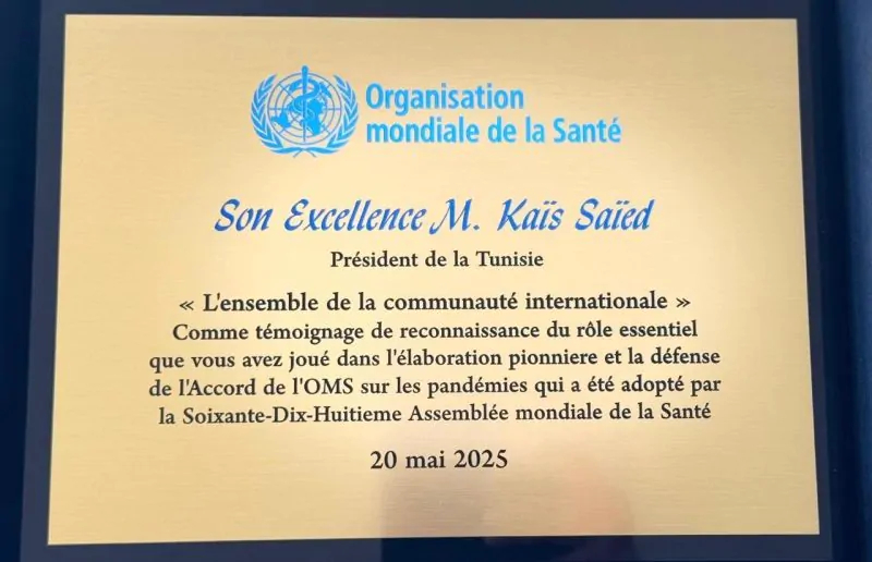 ويأتي هذا التكريم، حسب البلاغ، تتويجًا للدور البارز الذي اضطلع به رئيس الجمهوريّة في بلورة هذه المبادرة التاريخية، التي صادقت عليها الدورة 78 لجمعية الصحة العالمية في 20 ماي 2025، والتي تمثل خطوة فارقة في تعزيز النظام الصحي متعدد الأطراف وتحقيق الأمن الصحي للأجيال القادمة.