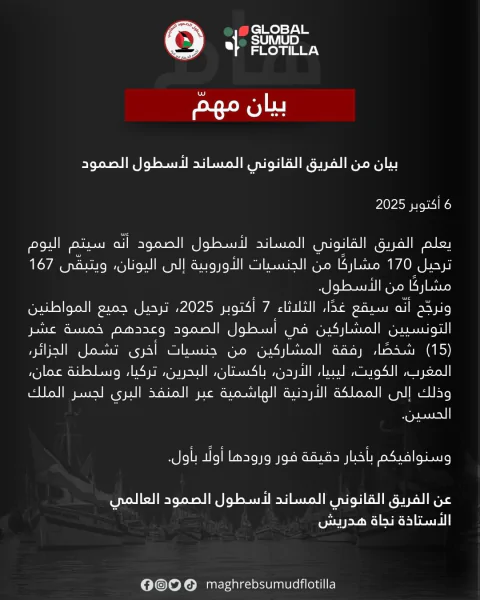اعلن الفريق القانوني المساند لأسطول الصمود أنّه سيتم اليوم ترحيل 170 مشاركًا من الجنسيات الأوروبية إلى اليونان، ويتبقى 167 مشاركًا من الأسطول. ورجح الفريق أنّه سيقع غدًا، الثلاثاء 7 أكتوبر 2025، ترحيل جميع المواطنين التونسيين المشاركين في أسطول الصمود وعددهم خمسة عشر (15) شخصًا، رفقة المشاركين من جنسيات أخرى تشمل الجزائر، المغرب، الكويت، ليبيا، الأردن، باكستان، البحرين، تركيا، وسلطنة عمان، وذلك إلى المملكة الأردنية الهاشمية عبر المنفذ البري لجسر الملك الحسين.