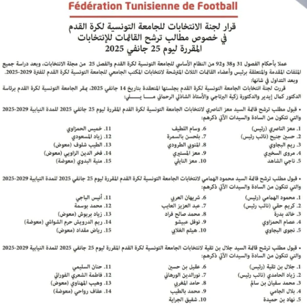 رياضة: اعلنت هيئة التسوية بالجامعة التونسية لكرة القدم قبول القائمات الثلاثة المترشحة لإنتخابات الجامعة التونسية لكرة والمبرمجة بتاريخ 25 جانفي 2025 قراءة المزيد اعلنت هيئة التسوية بالجامعة التونسية لكرة القدم قبول القائمات الثلاثة المترشحة لإنتخابات الجامعة التونسية لكرة والمبرمجة بتاريخ 25 جانفي 2025 وجاء هذا في بلاغ صادر اليوم الثلاثاء 14 جانفي 2025 عن الجامعة التونسية لكرة القدم بصفحتها الرسمية على الفايسبوك اتفاقية استشهار لجامعة القدم مع MG Motorsجلسة عمل بجامعة كرة القدم لتطوير العلاقة بين الحكام والجمعياتالموافقة على نشر تسجيلات 'الفار' للعمومالمزيد من الأخبار