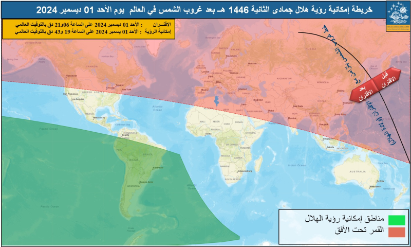 ويحدث الاقتران المركزي بين الشمس والقمر، وفق الحسابات الفلكية، يوم الأحد 01 ديسمبر 2024 على الساعة السابعة صباحا و 21 دقيقة حسب التوقيت المحلي لمدينة تونس. يغيب القمر قبل غروب شمس يوم الأحد 01 ديسمبر 2024 في أغلب البلدان العربية والإسلامية على غرار البلاد التونسية. وتبعا للمعطيات الفلكية فإنه لا يمكن رؤية هلال جمادى الثانية بعد غروب شمس يوم الأحد 01 ديسمبر في كل الدول الإسلامية إلا أنه يمكن رؤية الهلال في العالم يوم الأحد وذلك بداية من الساعة الثامنة مساء و43 دقيقة حسب التوقيت المحلي، انطلاقا من جنوب وسط المحيط الأطلسي ثم تباعا باتجاه الغرب كما توضحه الخريطة المصاحبة. وأكد المعهد أن الإعلان عن بداية الشهر القمري يتم من قبل ديوان الإفتاء بالجمهورية التونسية.