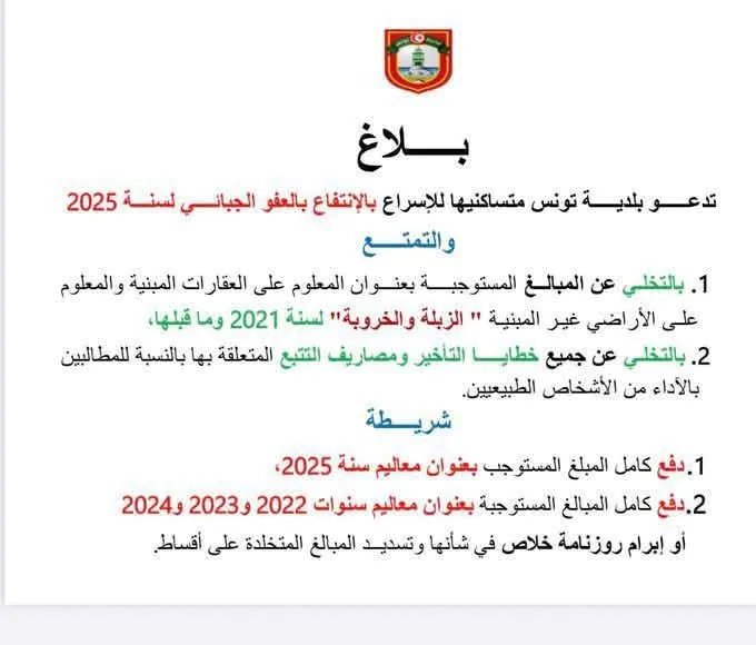 وطنية: دعت بلدية تونس متساكنيها إلى الإسراع بخلاص الأداء البلدي لسنة 2025، والاستفادة من إجراءات الإعفاء التي أقرّها القانون.