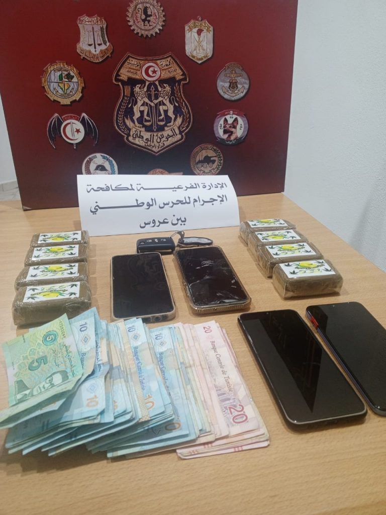 تمكنت الادارة الفرعية لمكافحة الإجرام بإدارة الشؤون العدلية للحرس الوطني ببن عروس من الاطاحة بوفاق إجرامي ينشط بين مدينة بن عروس و جبل جلود متكون من 04 انفار من اجل الاتجار في المواد المخدرة وحجز 08 صفائح من مخدر القنب الهندي ‘ زطلة ‘ وحجز وسيلة تستعمل في تنقلاتهم ومبلغ مالي قدره 815 دينار متأتيا من عائدات الترويج.