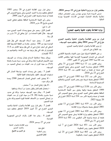 صدر بالعدد الأخير للرائد الرسمي للجمهورية التونسية بتاريخ أمس 27 ديسمبر 2024، قرار من وزير الفلاحـة والموارد المائية والصيد البحري يتعلّق بتنظيم صيد أسماك البوسيف.