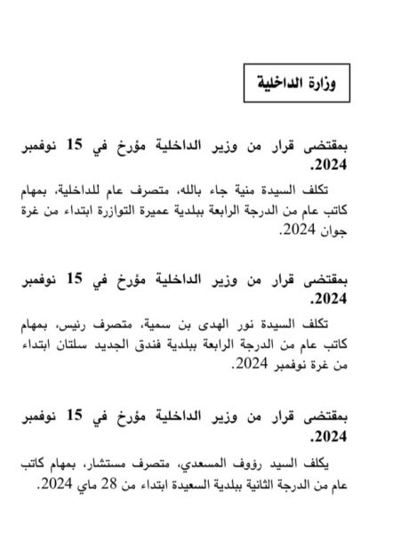 وطنية: تسمية كتاب عامين لعدد من البلديات بقرار من وزير الداخلية صادر في الرائد الرسمي. قراءة المزيد صدر بالرائد الرسمي للجمهورية التونسية قرارا من وزير الداخلية مؤرخ في 15 نوفمبر 2024، ويقضي بتسمية كتاب عامين لعدد من البلديات وهي على النحو التالي: تونس الآن/ النشرة المسائية ليوم السبت 13 ديسمبر 2025كرة اليد: نتائج مباريات الجولة الـ18كرة الطائرة/ نتائج مفابلات الجولة الـ5المزيد من الأخبار