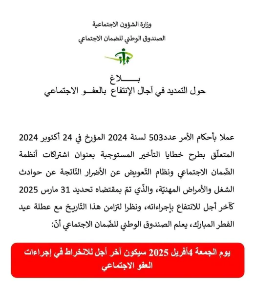 أعلن الصندوق الوطني للضّمان الاجتماعي أنّ يوم الجمعة 4 أفريل 2025، سيكون آخر أجل للإنخراط في إجراءات العفو الاجتماعي.