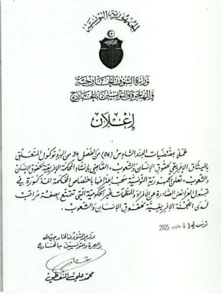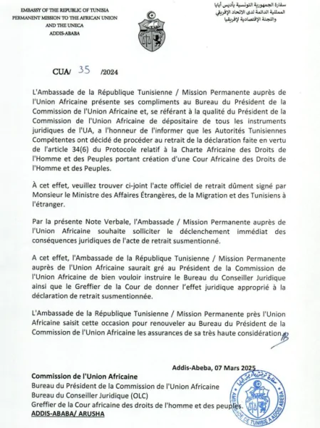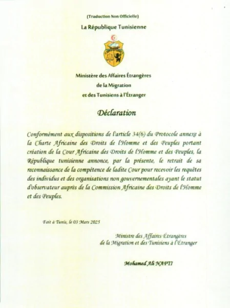 وطنية: اعلنت تونس عبر وزارة الخارجية عن سحب اعترافها باختصاصات المحكمة الافريقية لحقوق الانسان والشعوب في قبول العرائض الصادرة عن الافراد والمنظمات غير الحكومية