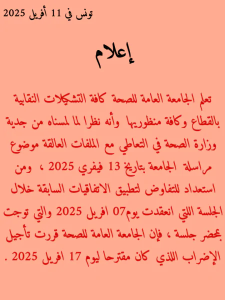 قررت الجامعة العامة للصحة اليوم الجمعة في بلاغ موجه لكافة التشكيلات النقابية بالقطاع ومنظوريها تأجيل الإضراب الذي كان مقترحا ليوم 17 أفريل 2025.