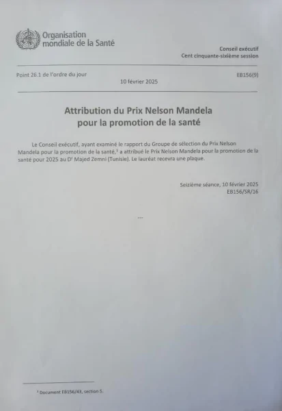 تحصّل الدكتور ماجد الزمني، مرشّح تونس، على جائزة نيلسون مانديلا للنهوض بالصحة لسنة 2025، التي أسندها المدير العام لمنظمة الصحّة العالمية اليوم الجمعة 23 ماي بجنيف، تقديرًا لمسيرته المهنية وإسهاماته البارزة في تطوير القطاع الصحي