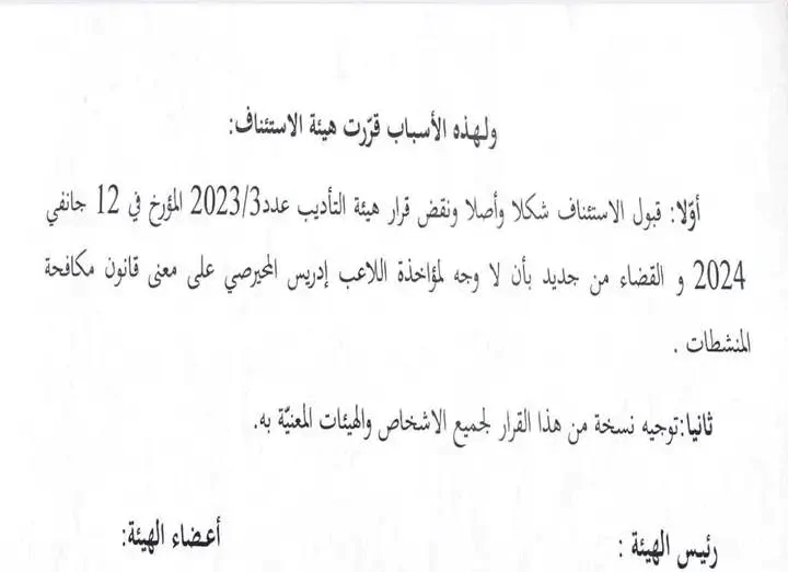 وقررت الهيئة رفع العقوبة التي صدرت في حقه في الطور الابتدائي، والتي كانت تقضي بإيقافه عن اللعب لمدة أربع سنوات انطلاقًا من 12 أكتوبر 2023، على خلفية اتهامه بتناول مادة محظورة.