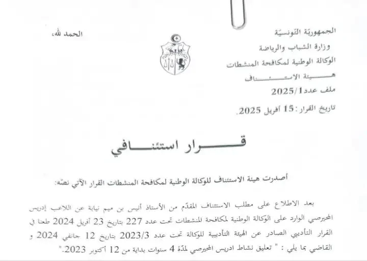 قضت هيئة الاستئناف التابعة للوكالة الوطنية لمكافحة المنشطات، اليوم الثلاثاء 15 أفريل 2025، بعدم ثبوت الإدانة في حق اللاعب إدريس المحيرصي.