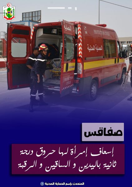وطنية: تولت فرق النجدة والإنقاذ التابعة للإدارة الجهوية للحماية المدنية بصفاقس التدخل لإسعاف إمرأة تبلغ من العمر 39 سنة لها حروق درجة ثانية باليدين والساقين والرقبة إثر محاولتها إخماد حريق بقارورة غاز منزلي.