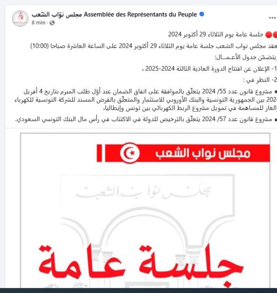 وطنية: ستنظر الجلسة في مشروع قانون عدد 55/ 2024 يتعلّق بالموافقة على اتفاق الضمان عند أوّل طلب المبرم بتاريخ 4 أفريل 2024 بين الجمهورية التونسية والبنك الأوروبي للاستثمار والمتعلّق بالقرض المسند للشركة التونسية للكهرباء والغاز للمساهمة في تمويل مشروع الربط الكهربائي بين تونس وإيطاليا،