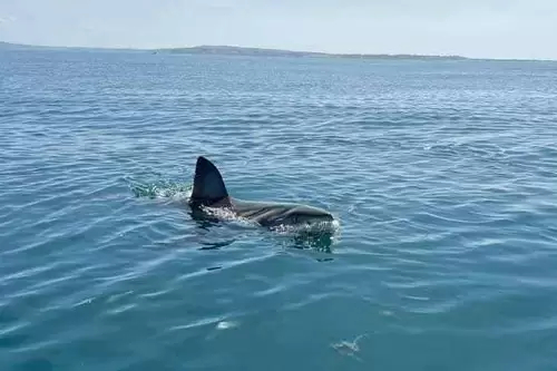 على بعد 3 أو 4 أميال على ميناء قمرت، تم العثور على قرش أبيض ضخم يسبح في عمق حوالي 30 أو 35 مبتر.