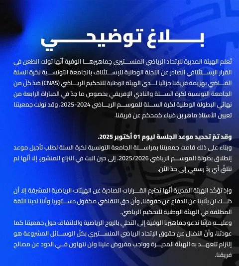 أصدرت الهيئة المديرة للاتحاد الرياضي المنستيري بيانًا عبر صفحتها الرسمية أعلنت فيه أنها تقدّمت بطعن لدى “الكناس” ضد الجامعة التونسية لكرة السلة والنادي الإفريقي