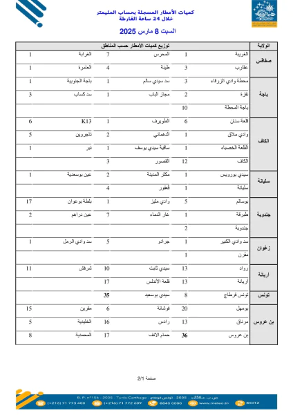 نشر المعهد الوطني للرصد الجوي قائمة أولية لكميّات الأمطار المسجلة خلال 24 ساعة الفارطة من الساعة 07:00 ليوم الجمعة 07 إلى الساعة 07:00 ليوم السبت 08 مارس 2025.