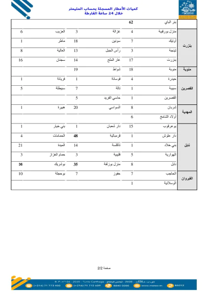 نشرالمعهد الوطني للرصد الجوي قائمة أولية لكميّات الأمطار المسجلة خلال 24 ساعة الفارطة من الساعة 07:00 ليوم الجمعة 07 إلى الساعة 07:00 ليوم السبت 08 مارس 2025.