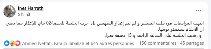 قرّرت هيئة الدائرة الجنائية المختصة بالنظر في قضايا الإرهاب بالمحكمة الابتدائية بتونس تأخير النظر في ملف التسفير إلى يوم الجمعة 2 ماي 2025 لإعذار المتهمين أي معرفة طلباتهم من المحكمة بخصوص الملف والتصريح بالحكم، حسب ما اعلنت المحامية في الملف ايناس الحراث.