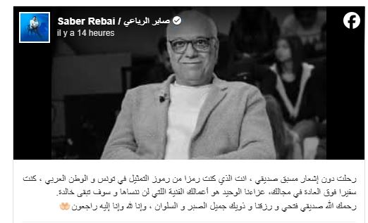 ونعى الفنان صابر الرباعي الهدواي قائلا “رحلت دون إشعار مسبق صديقي، أنت الذي كنت رمزا من رموز التمثيل في تونس والوطن العربي، كنت سفيرا فوق العادة في مجالك، عزاؤنا الوحيد هو أعمالك الفنية التي لن ننساها وسوف تبقى خالدة”.