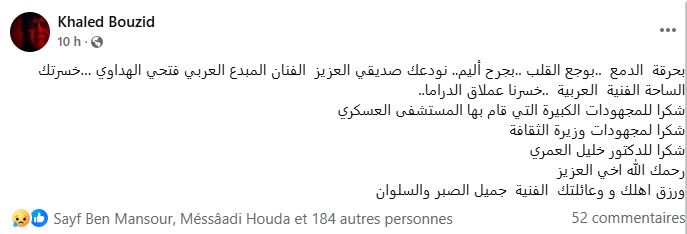 ونشر المخرج عبد الحميد بوشناق صورة الهداوي عبر حسابه الرسمي بموقع “فيسبوك” صورة الراحل مرفوقة بتعليق “إلى اللقاء صديقي المبدع”.