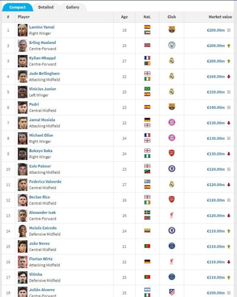 ونشر موقع Transermarkt المتخصص في أخبار الانتقالات والقيمة السوقية للاعبين، تحديثًا للقائمة التي تعتمد على الأداء، العمر، النادي، ومعايير أخرى، مشيرًا إلى أن هذه القيم تعكس مؤشراً تقديريًا لقيمة اللاعب لكنها ليست دقيقة تمامًا.