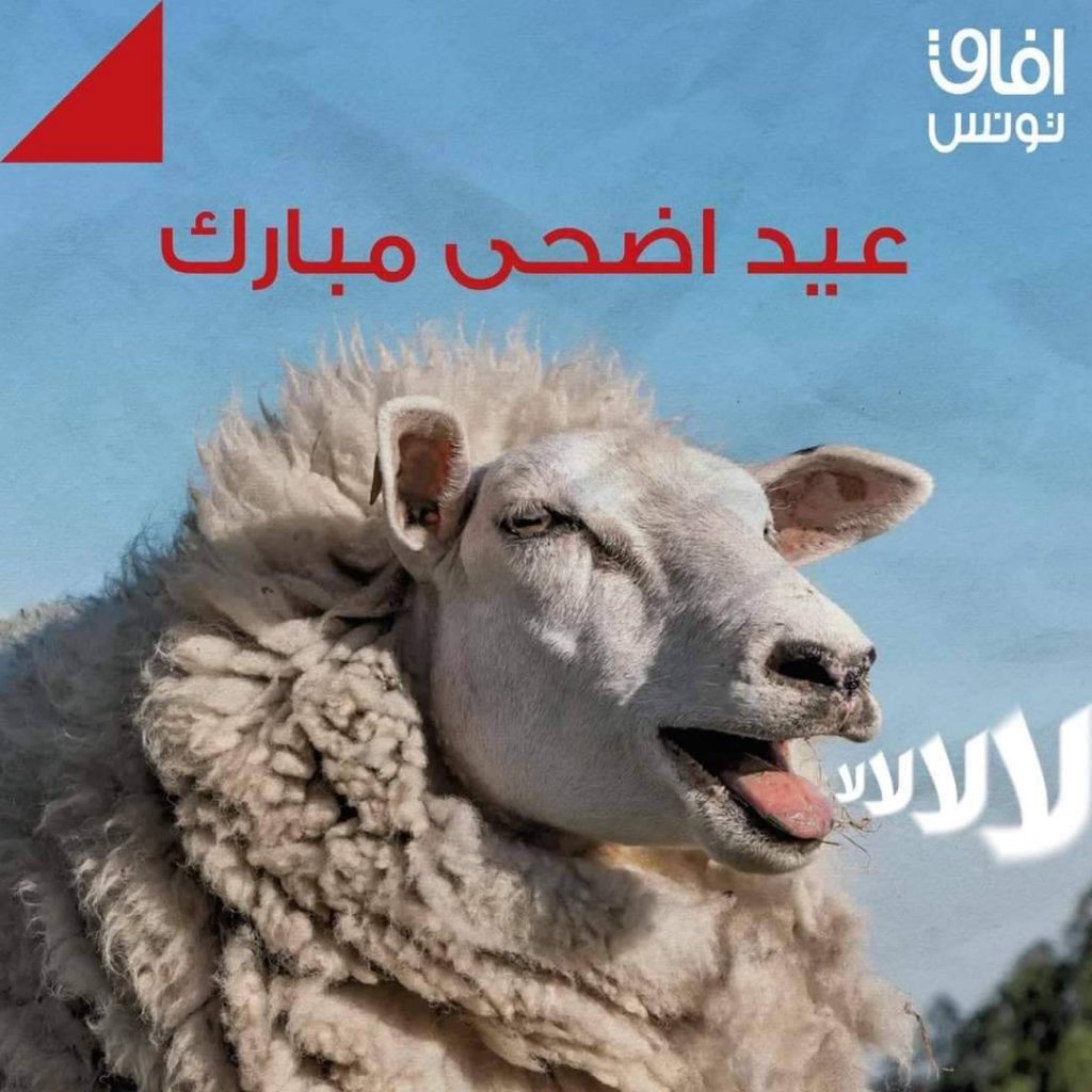 في إطار حملته ضد الاستفتاء ودعوة التونسيين للتصويت بـ “لا” على مشروع الدستور الجديد، تفاعل حزب آفاق تونس بنشر صورة طريفة لتهنئة التونسيين بعيد الأضحى المبارك وتذكيرهم في نفس الوقت ضرورة التصويت برفض الدستور الجديد.