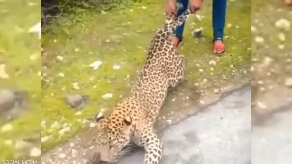 ويظهر المقطع، الرجل وهو يسحب الفهد من ذيله ورجله، بينما شوهد آخرون يلتقطون الصور ويبتسمون لكاميراتهم أثناء التصوير، دون الاكتراث بمعاناة الحيوان.