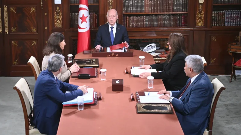 أشرف قيس سعيّد، رئيس تونس، يوم الاثنين 27 أفريل 2026، على اجتماع ضمّ رئيسة الحكومة سارة الزعفراني الزنزري، ووزيرة المالية مشكاة سلامة الخالدي، ووزير الشؤون الاجتماعية عصام الأحمر، ووزير التشغيل والتكوين المهني رياض شوّد.