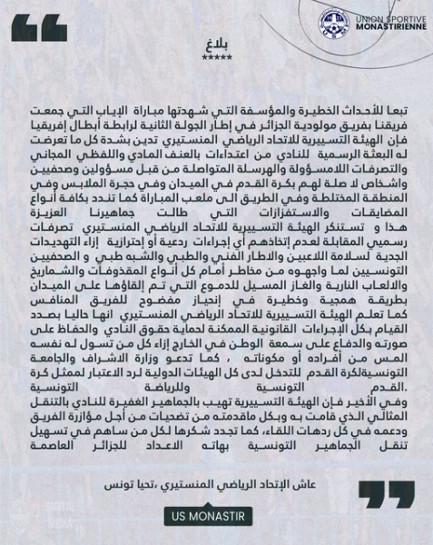 أصدرت الهيئة التسييرية للاتحاد الرياضي المنستيري بلاغا على صفحتها الرسمية على الفايسبوك أدانت بشدة كل ما تعرضت له البعثة الرسمية للنادي من اعتداءات بالعنف المادي واللفظي المجاني والتصرفات اللامسؤولة والهرسلة