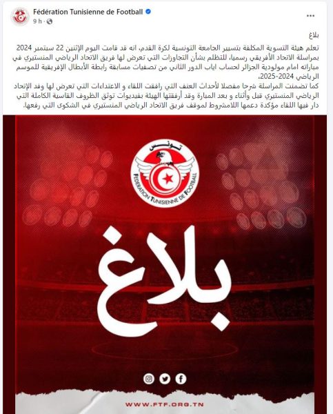 كرة قدم: قامت هيئة التسوية المكلفة بتسيير الجامعة التونسية لكرة القدم امس الإثنين 22 سبتمبر 2024 بمراسلة الاتحاد الأفريقي رسميا، للتظلم بشأن التجاوزات التي تعرض لها فريق الاتحاد الرياضي المنستيري