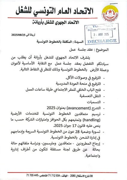 وفي سياق متصل، دعا الاتحاد الجهوي للشغل بأريانة إلى عقد جلسة عمل مع إدارة الشركة لبحث مطالب تتعلق بالترفيع في وصولات الأكل ومنحة العودة المدرسية، وفتح الباب الخلفي للمقر الاجتماعي، فضلا عن النظر في النقل التعسفية والتسميات، إضافة إلى تسوية وضعية 28 عونًا من الخطوط التونسية السريعة وإدماجهم في إدارة الشحن.