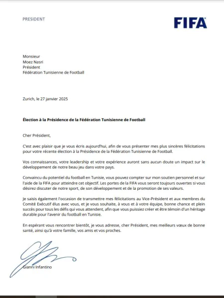 رياضة: راسل الإتحاد الدولي لكرة القدم اليوم الاثنين 27 جانفي 2025 المكتب الجامعي الجديد للجامعة التونسية لكرة القدم مهنئا إياه بالفوز في الإنتخابات. قراءة المزيد راسل الإتحاد الدولي لكرة القدم اليوم الاثنين 27 جانفي 2025 المكتب الجامعي الجديد للجامعة التونسية لكرة القدم مهنئا إياه بالفوز في الإنتخابات. وتوصلت الكتابة العامة للجامعة بمراسلة من الفيفا بامضاء رئيسها جياني انفانتينو حيث قام بتهنئة الناصري ومن معه بهذه المهمة الجديدة متمنيا لهم التوفيق في تطوير كرة القدم التونسية. وفي ما يلي المراسلة:الجامعة تضم المهاجم أمين الدبابي للمنتخب الوطنيبلاغ من الجامعة حول بث مباريات الرابطة الثانيةجامعة كرة القدم: اليوم إنتخاب اللّجان المستقلّةالمزيد من الأخبار