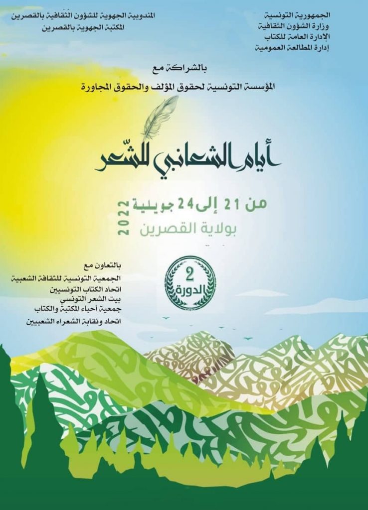 تنظم إدارة المطالعة العمومية بالشراكة مع المندوبية الجهوية للشؤون الثقافية والمكتبة الجهوية بالقصرين والمؤسسة التونسية لحقوق المؤلف والحقوق المجاورة وبالتعاون مع اتحاد الكتاب التونسيين وبيت الشعر التونسي وجمعية أحباء المكتبة والكتاب واتحاد ونقابة الشعراء الشعبيين والجمعية التونسية للثقافة الشعبية وتحت إشراف وزارة الشؤون الثقافية تظاهرة” أيام الشعانبي للشعر” في دورتها الثانية بولاية القصرين خلال شهر جويلية 2022.