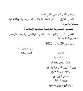 تضمن الرائد الرسمي الأخير الصادر اليوم الثلاثاء 5 أفريل 2022، […] قراءة المزيد تضمن الرائد الرسمي الأخير الصادر اليوم الثلاثاء 5 أفريل 2022، قرارا بإحداث قنصلية تونسية جديدة. وسيتم إحداث القنصلية بمدينة بولونيا الايطالية.
