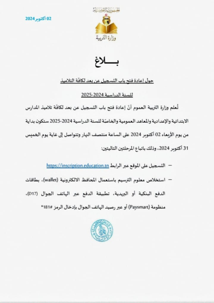 وطنية: أعلنت وزارة التربية في بلاغ الاربعاء 2 أكتوبر، عن إعادة فتح باب التسجيل عن بعد لكافة تلاميذ المدارس الابتدائية والاعدادية والمعاهد العمومية والخاصة للسنة الدراسية 2024_2025 قراءة المزيد أعلنت وزارة التربية في بلاغ الاربعاء 2 أكتوبر، عن إعادة فتح باب التسجيل عن بعد لكافة تلاميذ المدارس الابتدائية والاعدادية والمعاهد العمومية والخاصة للسنة الدراسية 2024_2025 بداية من اليوم على الساعة منتصف النهار وإلى غاية يوم الخميس 31 أكتوبر الجاريودعت الوزارة إلى اتباع المرحلتين التاليتين: التسجيل على الموقع عبر الرابط https://inscription.education.tnقابس/ 30 حالة اختناق في صفوف التلاميذقابس.. حالات اختناق جديدة في صفوف التلاميذالمسدّي: لماذا اقتصرت حالات الاختناق بقابس على التلاميذ فقط وليس العمال؟المزيد من الأخبار استخلاص معلوم الترسيم باستعمال المحافظ الالكترونية، بطاقات الدفع البنكية أو البريدية، تطبيقة الدفع عبر الهاتف الجوال (d17)، منظومة (paysmart)، أو عبر رصيد الهاتف الجوال بادخال الرمز *181#