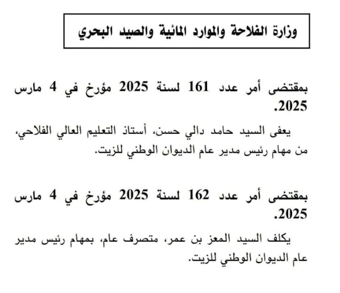 وطنية: تكليف المعز بن عمر خلفا له. قراءة المزيد صدر بالرائد الرسمي للجمهورية التونسية أمر عدد 161 مؤرخ في 4 مارس 2025 يقضي بإعفاء حامد دالي حسن الرئيس المدير العام للديوان الوطني للزيت من مهامه. وتم بمقتضى أمر عدد 162 تكليف المعز بن عمر خلفا له.الدماغ يعيد تشكيل نفسه 5 مرات على مدار العمرالذكاء الاصطناعي يعيد تشكيل ساحات الحروب'الكشري المصري' على رادار اليونسكوالمزيد من الأخبار
