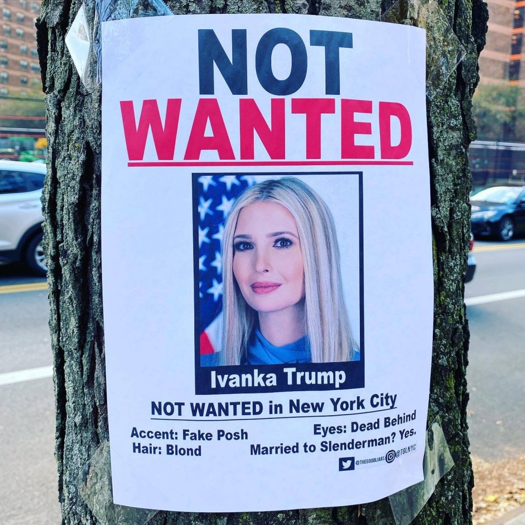 وكتب على المنشورات التي علقت على جدران المدينة وعلى الأعمدة “إيفانكا ترامب… غير مرغوب فيها بمدينة نيويورك”.