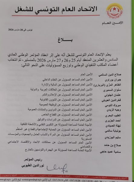 ويأتي انتخاب هذا المكتب التنفيذي الجديد في ختام المؤتمر العادي السادس والعشرين للاتحاد، وسط آمال بأن تقود القيادة الجديدة المنظمة النقابية في المرحلة المقبلة لمواجهة التحديات الاجتماعية والاقتصادية التي تعيشها البلاد.