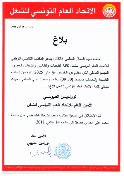 وبعد كلمة الطبوبي، ستنطلق مسيرة عمالية من ساحة محمد علي الحامي وصولًا إلى ساحة 14 جانفي 2011، وذلك دعمًا للشعب الفلسطيني، وفقًا لبيان صادر عن المكتب التنفيذي الوطني للاتحاد اليوم الجمعة 18 أفريل 2025.
