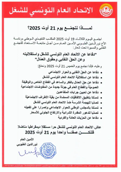 دعا الاتحاد العام التونسي للشغل في أعقاب اجتماع مكتبه التنفيذي اليوم الثلاثاء 19 أوت 2025 كافة منظوريه إلى إنجاح التجمع النقابي بعد غد الخميس ورص الصفوف
