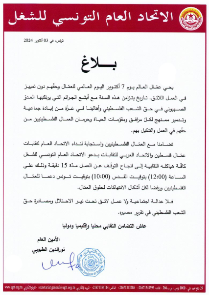 وذكر بان عمال العالم يحيون يوم 7 اكتوبر اليوم العالمي للعمال وحقهم دون تمييز في العمل اللائق وبأن هذا التاريخ يتزامن هذه السنة مع ابشع الجرائم التي يرتبكها العدو الصهيوني في حق الشعب الفلسطيني واهالي قطاع غزة من ابادة جماعية وتدمير ممنهج لكل مرافق ومقومات الحياة وحرمان العمال الفلسطينيين من حقهم في العمل والتنكيل بهم مؤكدا على انه لا عدالة اجتماعية ولا عمل لائق تحت نير الاحتلال ومصادرة حق الشعب الفلسطيني في تقرير مصيره.