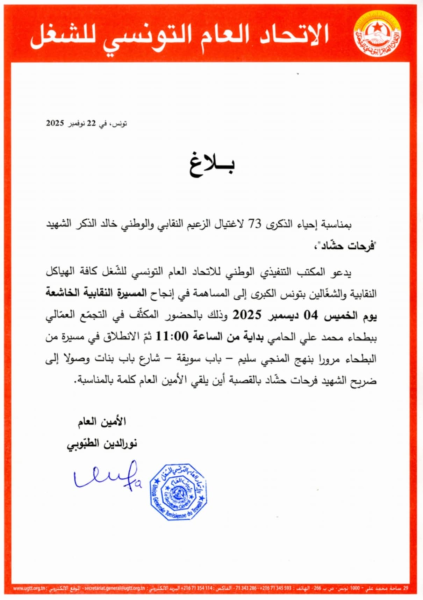 وطنية: أعلن الاتحاد العام التونسي للشغل عن تنظيم مسيرة يوم الخميس 4 ديسمبر 2025، تزامنًا مع الذكرى الثالثة والسبعين لاغتيال الزعيم النقابي والوطني فرحات حشاد.