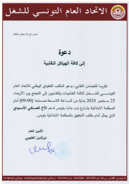 وطنية: دعا المكتب التنفيذي للاتحاد العام التونسي للشغل كافة النقابيين والنقابيات للتجمع يوم الأربعاء 25 سبتمبر بداية من الساعة التاسعة صباحا أمام مقر المحكمة الإبتدائية بباب بنات في العاصمة، لدعم الصنكي الأسودي الذي يمثل أمام مكتب التحقيق بالمحكمة.