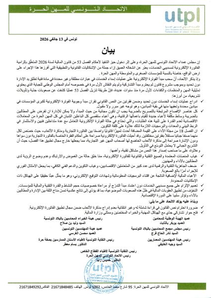 عبّر مجلس عمداء الاتحاد التونسي للمهن الحرة عن انشغاله العميق إزاء الإشكاليات القانونية والتطبيقية التي أفرزها دخول أحكام الفصل 53 من قانون المالية لسنة 2026 حيّز التنفيذ، والمتعلق بإلزامية الفوترة الإلكترونية لمسدي الخدمات، خاصة بالنسبة للمؤسسات الصغرى والمتوسطة والمهن الحرة.