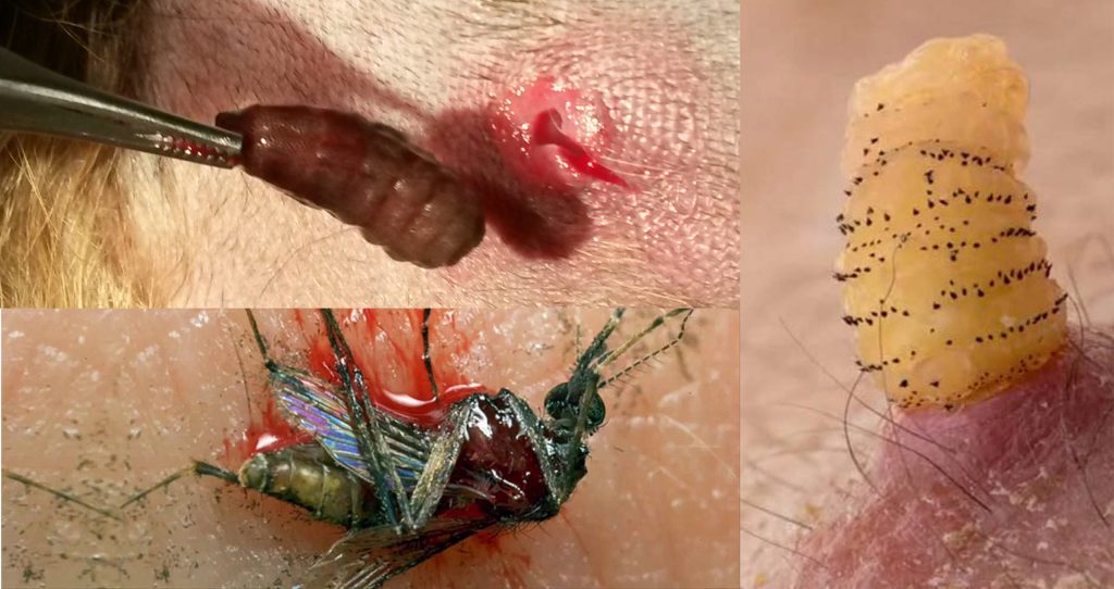 لكن ماذا يحدث للفرد المصاب؟ فقط التهاب جلدي موضعي يشبه التهاب قرص الباعوض لكنه في الحقيقة وبمجرد ان يقوم الطبيب بفقإ مكان الالتهاب حتى تظهر اليرقة كما تبينها الصور