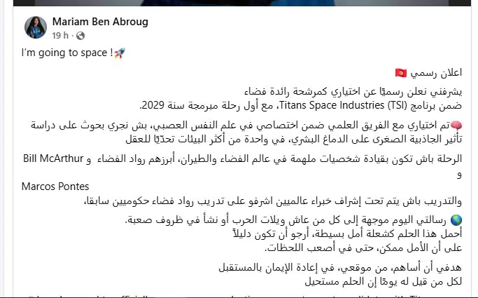 اعلنت الشابة التونسية مريم بن عبروق أنه تم اختيارها كمرشحة رائدة فضاء ضمن برنامج Titans Space Industries (TSI)، مع أول رحلة مبرمجة سنة 2029.
